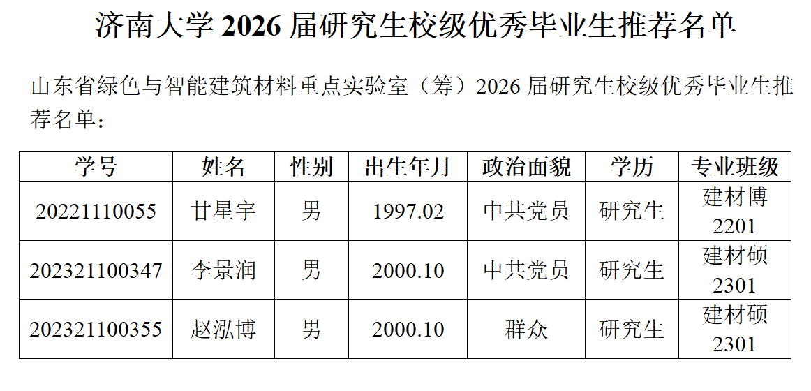 山东省绿色与智能建筑材料重点实验室(筹)2026届研究生校级优秀毕业生推荐名单